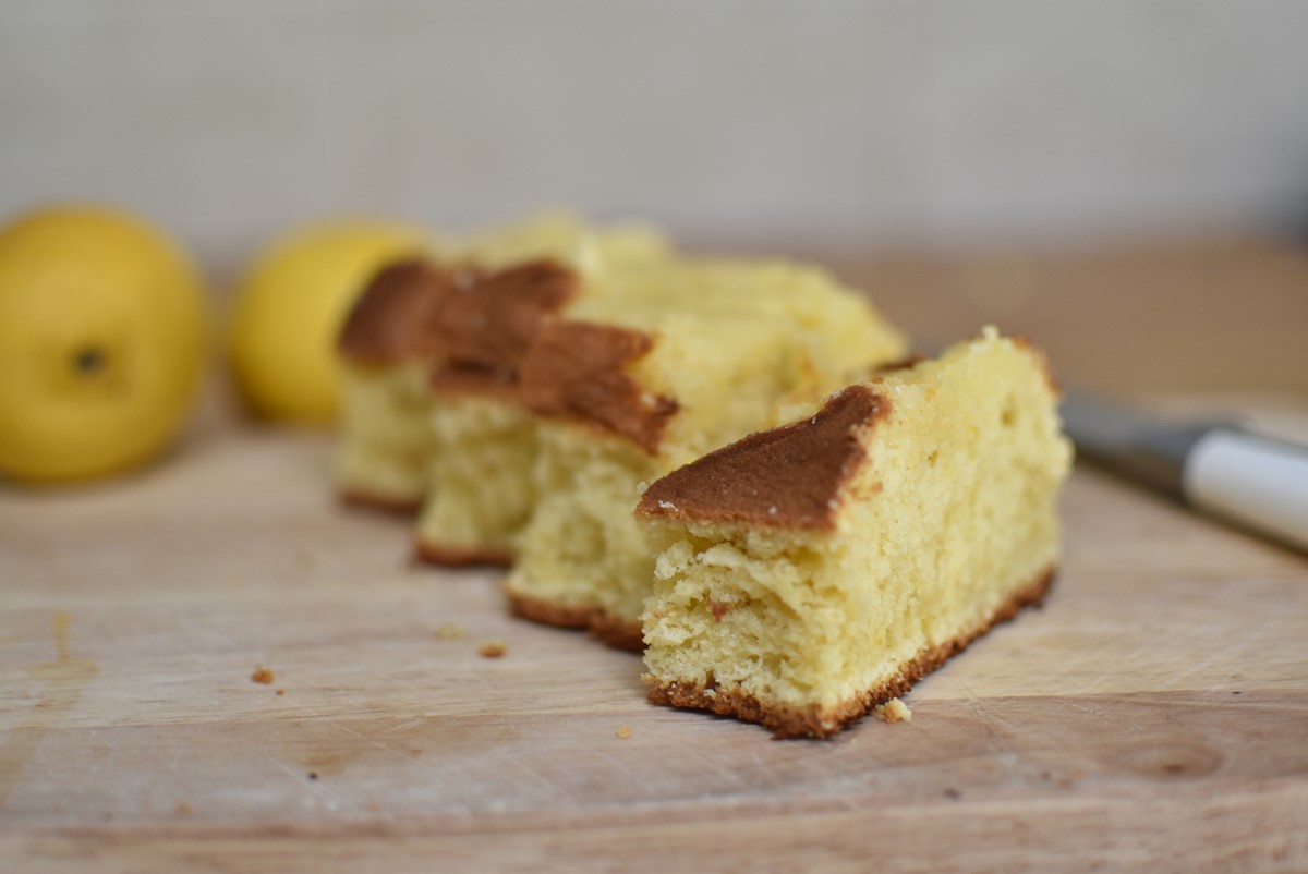 - For the icing, beat together the lemon juice and sugar and pour the mixture evenly over the cake once cooked but while it is still hot. Make sure you’ve turned it out onto a cooling rack first.